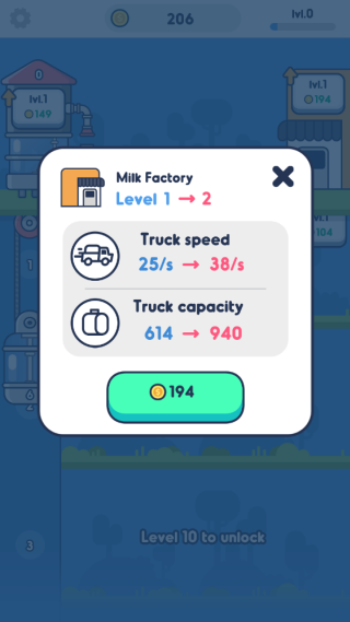 3.升级工厂等级,能够提升运奶卡车的速度和容量。