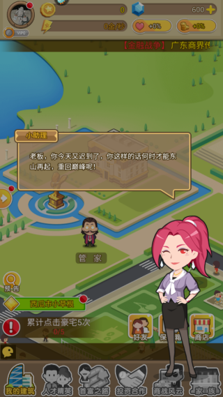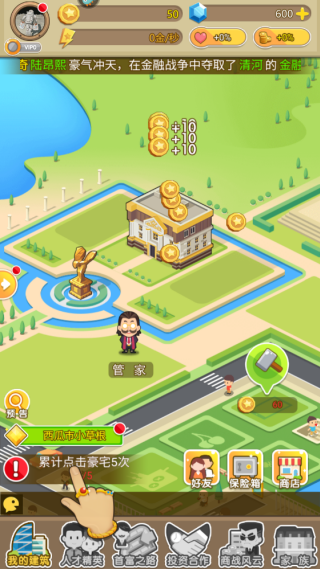 2.玩家可以通过点击豪宅或经营的小店来获得初始资金,并逐步解锁更多产业;