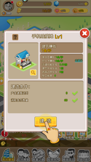 4.建造我们的第一家商铺,并不断升级商铺的等级,提升收益。