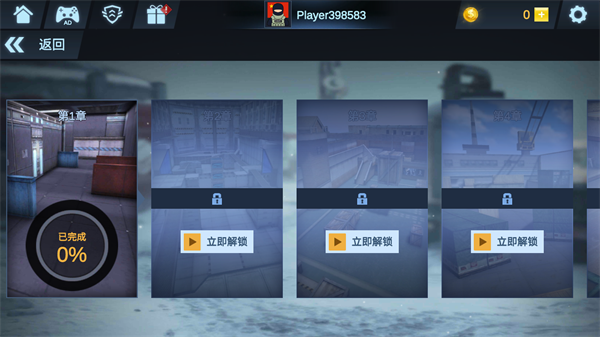 2、点击右侧关卡,我们从第一章开始,初次进入进度是0%,点击开始进入游戏;