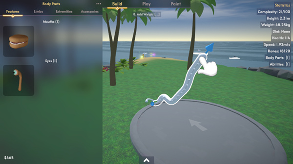 1、进入游戏后先切换到Build模式,从左侧选肢体部件组装生物,逐步搭建结构。