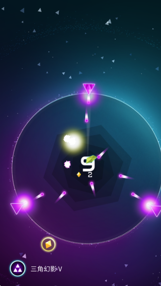 1.进入战斗后,玩家只需要点击屏幕,并以圆圈的方式移动三角战机,即可控制战机将出现的绿色宝石击碎得分。