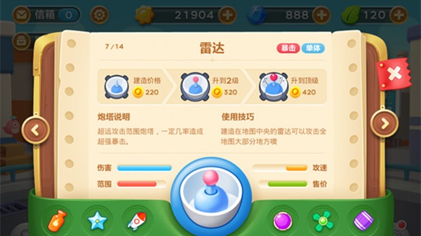 2、解锁 “雷达” 道具后,优先将其建造在地图中央位置,利用其超远攻击范围覆盖大部分区域。