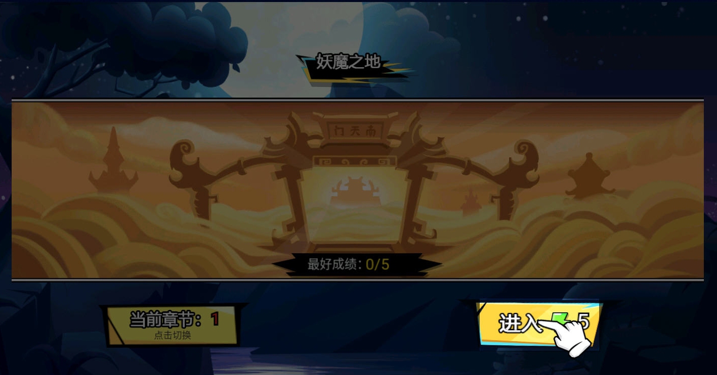 2、消耗体力进入妖魔之地第一章,挑战关卡提升最好成绩进度。