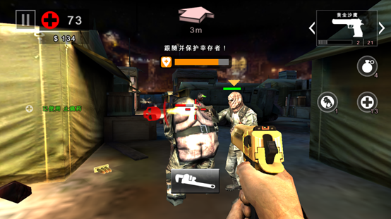 1、执行保护幸存者任务时,切换枪械集中攻击靠近目标的敌人,同时拾取场景道具恢复生命值。