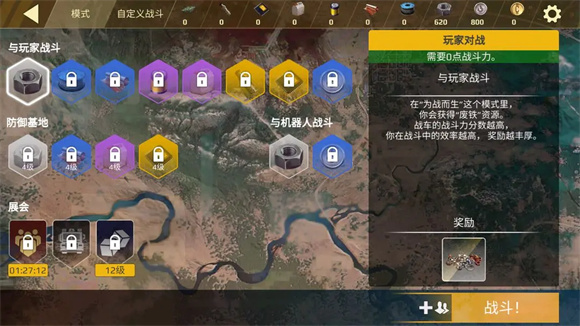 2、从下图可见,战斗选择界面主要由四个部分构成:与玩家对战、防御基地、与机器人战斗,以及属于乱斗模式的“展会”。一般来说,“防御基地”和我们平常理解的pve玩法较为相似,核心是在敌人定时刷新时守护好目标点位。
