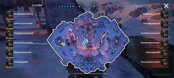 5、战场地图上会标注基地位置,其中队友和敌方战车的位置分别用蓝色和红色圆点标示,黄色圆点代表自身位置。