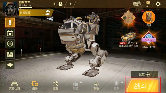 在创世战车移动版中,设有一个与端游相似的高亮战斗按钮以及一个试驾按钮。点击试驾按钮,就能在车库中对自己的战车进行测试驾驶;若点击战斗按钮,会先进入模式选择界面。
