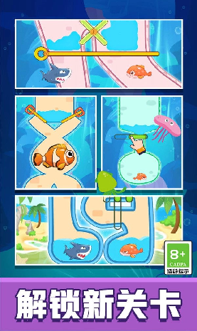 救救小金鱼游戏是一款极具挑战性的益智解谜类游戏,玩家在游戏中会面对一条被困的小鱼,其身旁还有同样被困的可怕鲨鱼。玩家需谨慎移动各类机关,解开小鱼前方的陷阱,助小鱼重返大海。但稍有差错就会放出鲨鱼,导致小鱼被鲨鱼吞食。