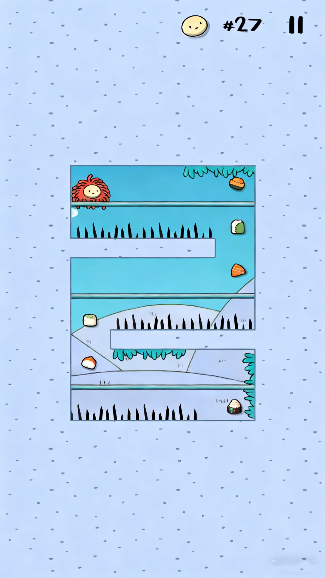 球球大搜捕是一款充满萌趣的休闲闯关类游戏,玩家将操控形似红色小怪物的球形角色展开冒险。场景中布满机关尖刺与隐藏陷阱,需通过收集寿司道具并规避致命风险才能成功通关。游戏采用治愈系画风设计,每道关卡均呈现独特的场景机制与视觉元素。
