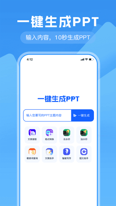 一键生成PPT是一个快速生成办公需求的软件,ai智能ppt神器,输入ppt主题内容一键快速生成高品质ppt的手机移动办公软件。