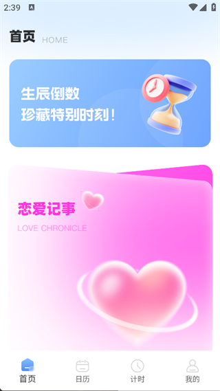 2. 在首页即可看到恋爱记事、生辰倒数等多个功能;