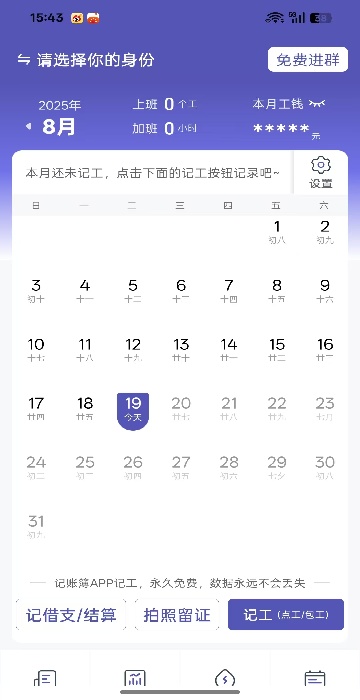 路径:首页→“工资对账”→选择记工方式(工天/工时/加班)→输入工资金额、结算状态(未结/已结)。