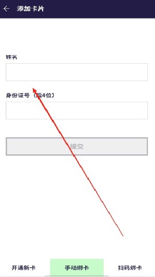 3. 在添加卡片页面,用户可选择手动绑卡,输入姓名与身份证号即可。