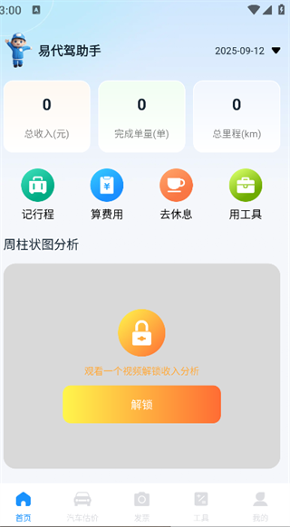 2. 在首页即可看到总收入、完成单量、总里程、算费用等功能;