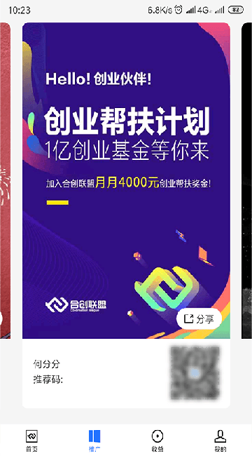 2、进入推广中心,可以获取项目的推广海报,轻松分享赚钱。通过将项目进行推广,就能轻松享提成。还可以分享推广平台的合作计划,扩大商业影响力。