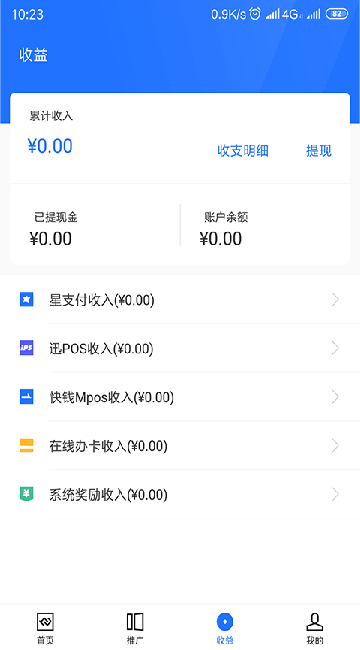 3、在收益中心,可以查看总数据信息,或选择特定栏查看详细收益。系统会统计用户的累计收入,通过收支明细可以查询每笔收入信息。