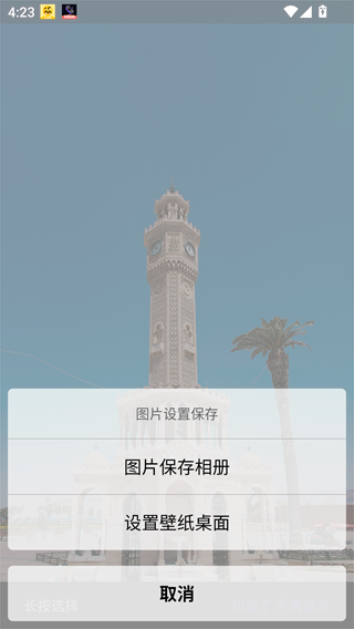 4、选择一个自己感兴趣的壁纸点击进入可以查看大图,然后长按屏幕,可以选择保存到相册或者直接设置为壁纸。