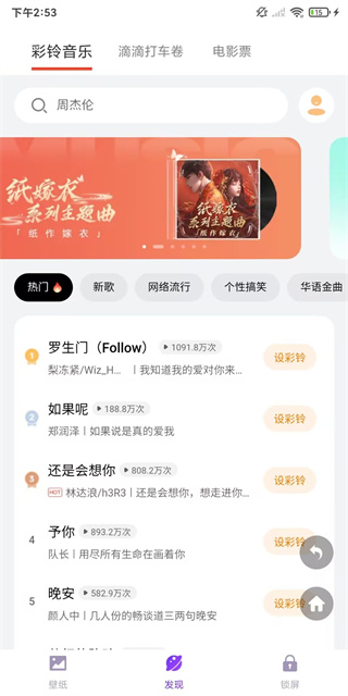 3、点击下方发现,可以看到各种彩铃音乐资源;