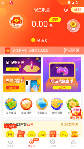 3、在首页可以看到充电赚钱、睡觉赚钱等各个功能入口;