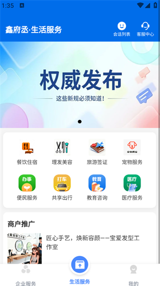 4. 点击页面下方的‘生活服务’,即可看到餐饮住宿、理发美容、旅游签证等服务。