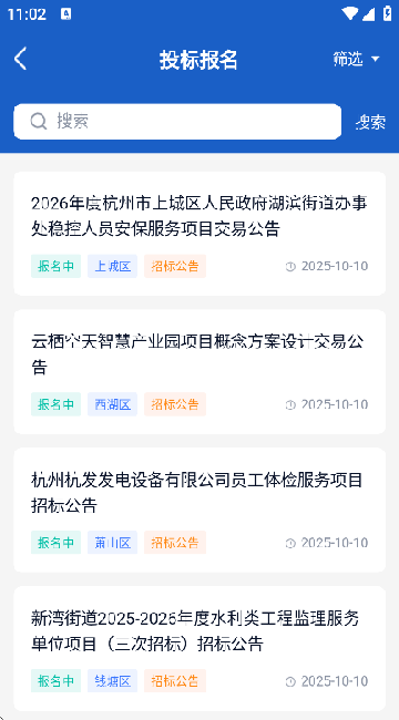 招必得app是专门给企业准备的招标软件。在这儿,能轻松知晓超多招标信息。瞅见合适的招标数据,就能方便地查看活动详情,还能参与竞标,帮不少企业找到好项目。有大量招标项目信息,随时能打开app随便浏览,也能用关键词快速搜索,迅速定位招标动态。还有开标直播板块,能看直播了解是否中标,第一时间掌握中标名单。有需要的企业赶紧下载招必得安卓版,以后就能轻松浏览各类招标内容啦!