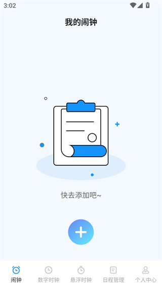 2、在首页可以添加你的闹钟,点击下方加号即可开始添加;