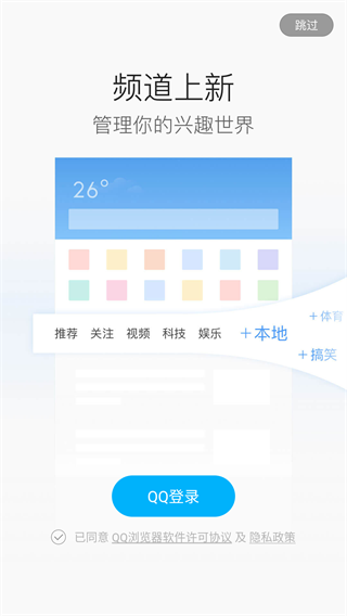 2、首次使用可以使用QQ登录,也可以直接点击右上角跳过;