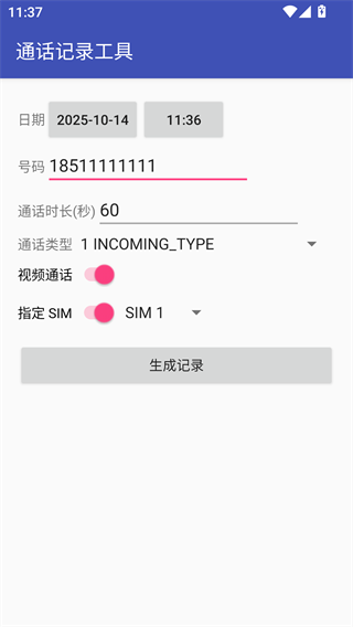 通话记录工具app是一款超厉害的应用,能伪造手机通话记录哦!它可以随意设置来电号码、归属地、通话时长、sim 卡信息等,功能超全面。你能修改来电和呼出时间,不管接通与否都能伪造,号码还能自定义,来电人备注也能改,能伪造各种通话记录。通话记录类型可自定义,来电、去电、未接来电一键伪造,高清语音和视频通话记录也支持伪造,轻松生成各类通话记录,有帮助就赶紧下载安卓版使用吧。