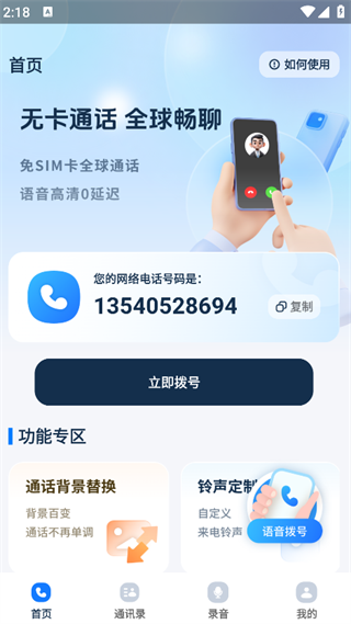 3. 在首页即可看到通话背景替换、铃声定制、语音拨号等功能;