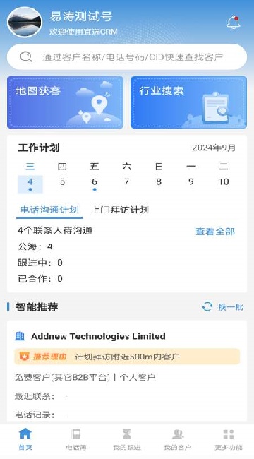 3、利用 LBS(地理位置服务)技术,在“附近的客户”功能中查看当前位置附近的高意向和公海客户。