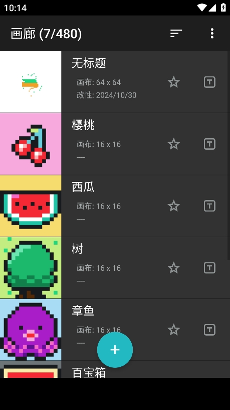 1、进入软件,你可以发现很多像素画的作品,点击加号图标,即可创建新的画布;