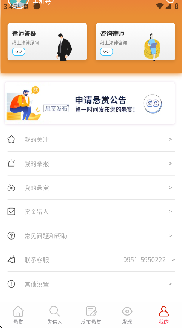 4、在我的页面中,即可在线咨询律师,并能联系客服