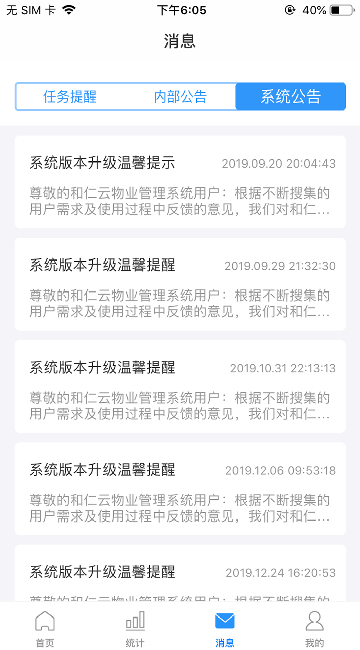 5、进入消息模块,了解人物信息、内部公告、系统公告等信息