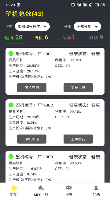 2、全部塑机能够自定义分组,可以按照塑机编号进行排序;