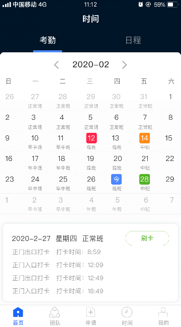 5、考勤明细展示,打开这里的日历即可对个人考勤历史进行查看;