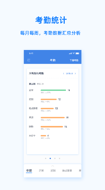 3、随时可在app内查看员工的考勤信息,同时自动统计异常考勤;