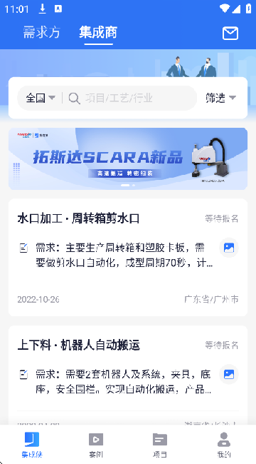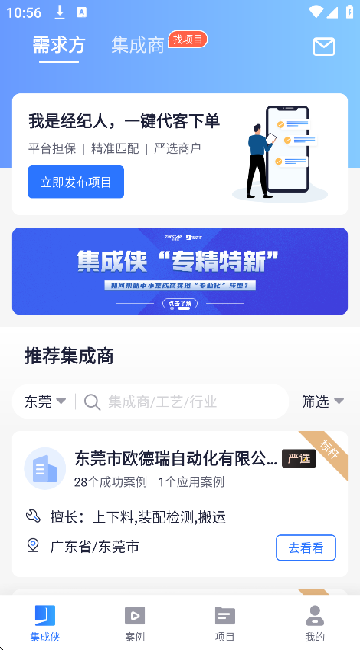 集成侠app是工业领域超实用的综合服务应用,专为采购商和集成商打造便捷服务。采购商能随时发新项目,一键下单超方便,经纪人入驻可代客下单,还能获优质集成商精准推荐,精准匹配功能超好用,人人都能享专属服务。集成商能发现海量项目商机,及时掌握需求方需求,智能匹配项目,用筛选功能找到合适项目就能在线报名,赶紧下载集成侠app吧!
