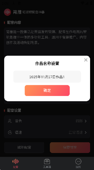 4、配音完成后点击保存即可,设置完名称后点击确定,还可以把作品下载到手机上。