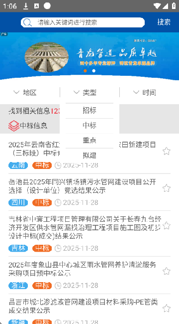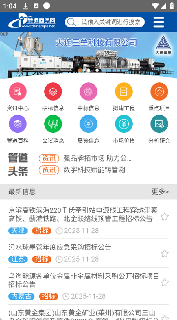 管道商务网该APP是为金属管道、钢筋混凝土管道、塑料管道等管道行业用户打造的招投标平台,可以在线查看整个管道行业的动态信息,也可以在APP中查看最新的招投标项目;平台上可关注投标频道,方便查看感兴趣的投标项目,让每个用户在线互动,轻松找到感兴趣的投标项目。投标项目并参与工程招标;中标信息将第一时间发布至平台,方便所有参与项目投标的企业轻松查看;中标后,单独分类提醒,确保用户能在最短的时间内掌握项目中标结果,轻松获得优质项目;搭建整个管道行业的动态交流平台,让有需要的用户轻松查看市场行情,关注重大管道事件。