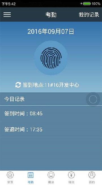 4、在考勤界面可以直接打卡,也可以查询自己的考勤记录。