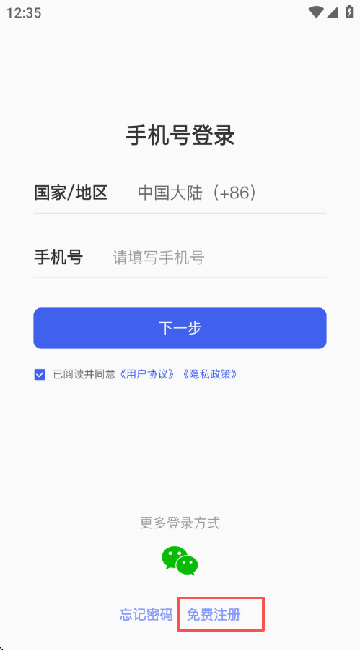 1、打开软件后点击下方的免费注册,输入手机号、验证码,设置密码完成注册。