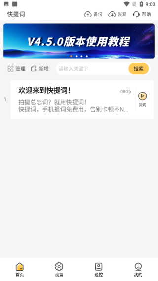 1、在首页可新增提词内容,同时能进行各类管理服务;