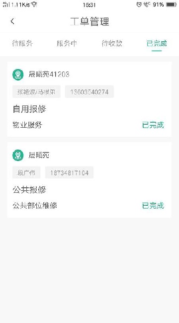 5、工单状态监控:待服务、待收款、已完成等状态实时查看;