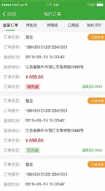 2、订单管理界面展示完整订单信息,包含工单编号、服务时间、地点及费用明细。