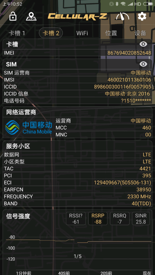 打开cellular-Z的首页,就能看到“卡槽1”的详细信息,详细到办卡地点、办卡时间,还有现在大肥彬所在的具体位置的经纬度,还有手机所驻留的网络是哪个小区的,都能看得一清二楚!