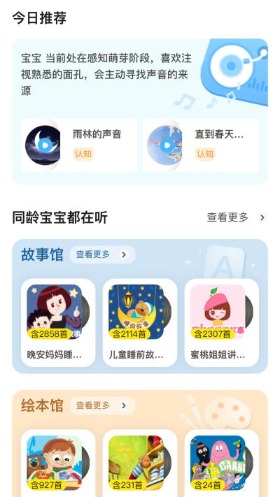 2、嗨宝宝app还提供了丰富的儿歌、故事、音乐等内容,可以陪伴宝宝学习、娱乐,促进宝宝的综合发展。