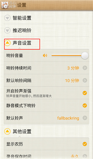 5、然后点击齿轮状图标,点击声音设置,设置好相关的音量、响铃间隔、持续时间等等即可
