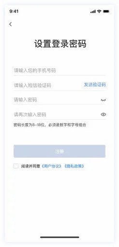 第三步:输入手机号,点击发送验证码,输入收到的验证码。设置登录密码,再次输入密码进行确认,勾选用户协议和隐私政策,点击注册后,便完成了注册。