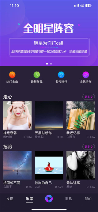 3、【各类榜单】浏览与观赏平台内最优质的明星与音乐人的作品,进行收藏;